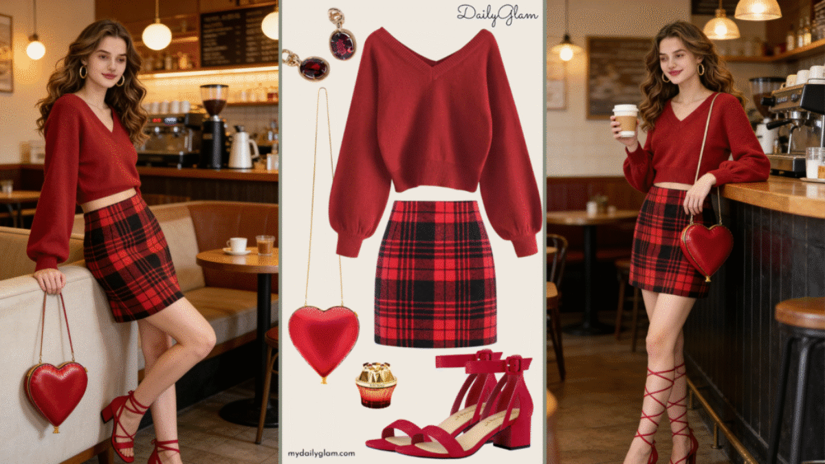 If you’re after a bold yet cozy fall winter red outfit that balances warmth and playfulness, this combo of a burgundy cropped V-neck sweater and red-black plaid mini skirt is perfect. It works for mild fall/winter days (pair with sheer red tights under the skirt—yes, the red suede sandals still fit!) and suits brunch, date […]