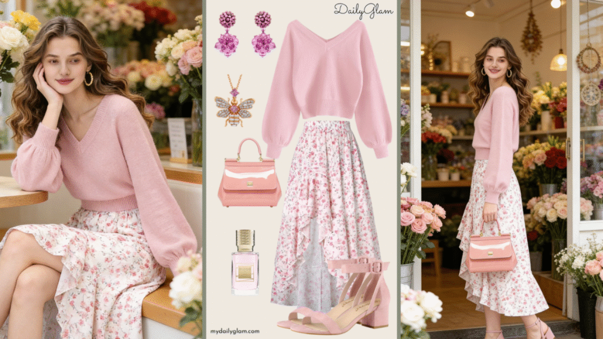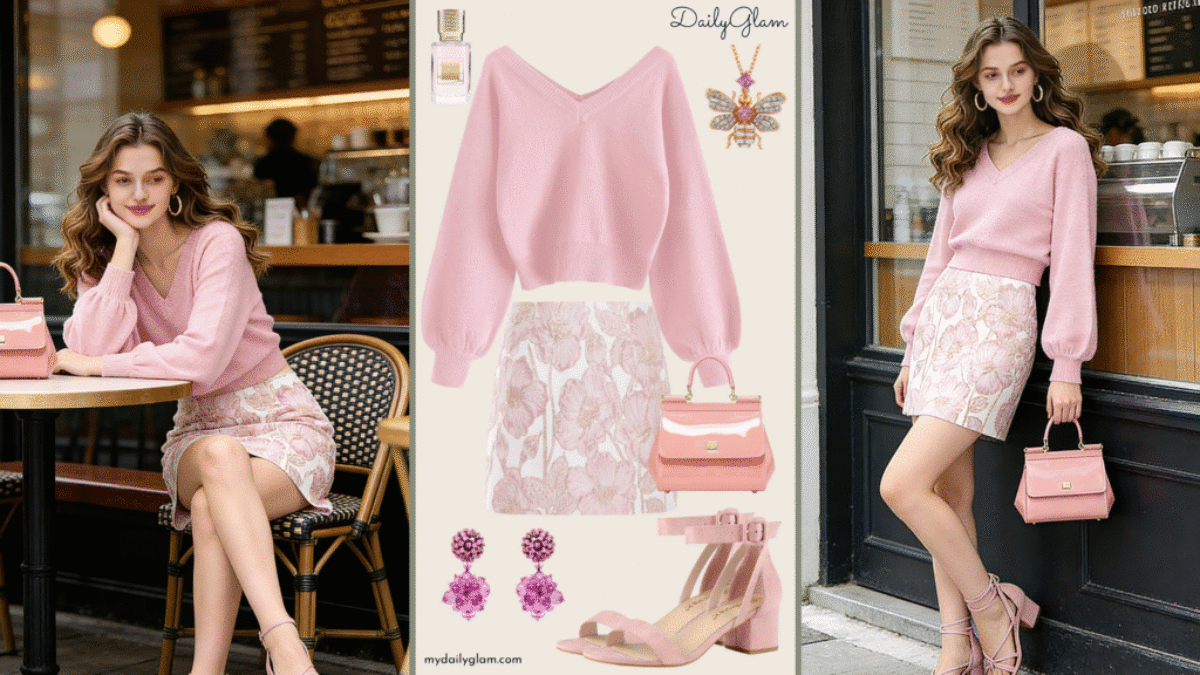 If you’re after a romantic yet cozy fall winter soft pink floral mini skirt outfit that balances warmth and playfulness, this combo of a soft pink cropped V-neck sweater and pink floral jacquard mini skirt is perfect. It works for mild fall/winter days (pair with sheer light pink tights under the skirt—yes, the pink suede […]