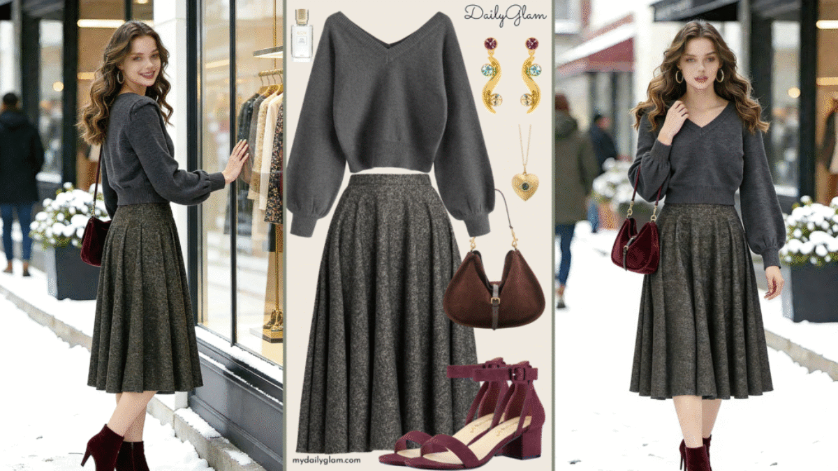 If you want a red brown winter outfit that feels eye-catching without being overdone, warm without looking bulky, this look is an easy win. A red chunky knit cropped sweater paired with a red brown plaid wool midi skirt blends vintage warmth with sweet-and-spicy details. Even styled with sandals, tonal coordination makes it work beautifully for southern […]