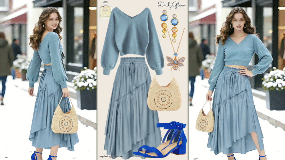 Tired of earthy tones dominating your winter wardrobe?This soft blue gradient knit set brings a breath of fresh air to cute casual winter outfits, blending relaxed elegance with gentle femininity. Featuring a light blue cropped cardigan paired with a tonal flowing maxi skirt, this look works effortlessly for workdays and doubles as a graceful first […]