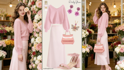Fall Winter Soft Pink Monochrome Chic Outfit: Cropped Sweater + Satin Midi Skirt