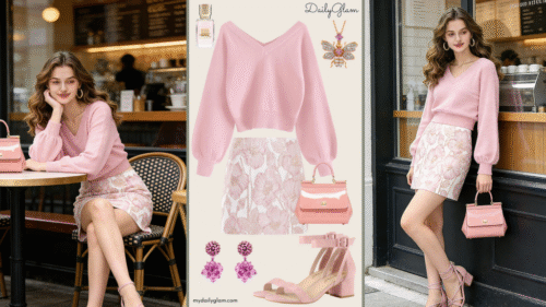 Fall Winter Soft Pink Floral Mini Skirt Outfit: Cropped Sweater + Jacquard Mini Skirt