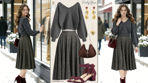 Fall Winter Charcoal Grey Pleated Midi Skirt Outfit: Cropped Sweater + Wool-Blend Pleated Skirt