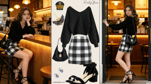 Fall Winter Black White Plaid Mini Skirt Outfit: Cropped Sweater + Edgy Plaid Skirt