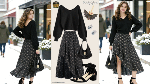 Fall Winter Black Floral Boho Maxi Skirt Outfit: Cropped Sweater + Ruffled Floral Skirt