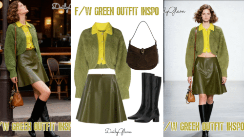 Fall Winter Green Layered Knit & Leather Skirt Outfit: Tonal Green + Pop of Yellow