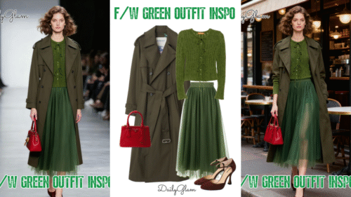 Fall Winter Green Tonal Layered Tulle Skirt Outfit: Feminine Green + Bold Red Contrast